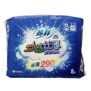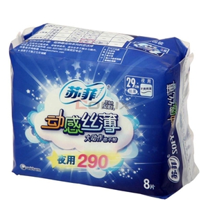 商品名称:苏菲 动感丝薄干爽卫生巾 夜用290mm 8片装 商品编号:436002 基本单位:包 最小采购单位:包(1) 箱包装量:1